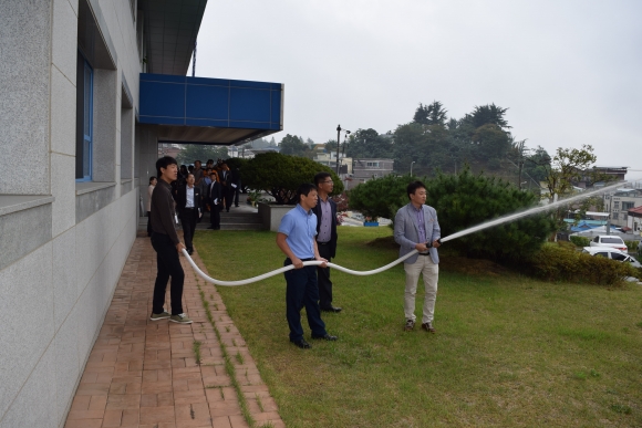 이론 교육을 마친 후 실제 화재상황을 가정하여 실제 대피훈련을 실시하고 옥내 소화전 및 소화기 사용법에 대한 교육 및 실습이 이어졌다.