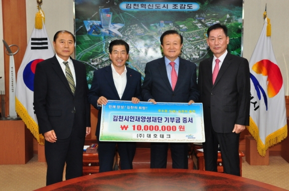 |  | | | ⓒ 김천내일신문 | | 김천의 교육발전을 위해 경남 창원시 소재 (주)대호테크(대표 정영화)에서 지난 10월 5일 김천시 인재양성재단(이사장 박보생)에 장학기금 1천만원을 기탁했다.