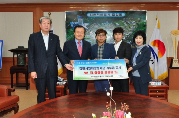 구미시 봉곡동 소재 (주)와촌유통(대표 정용), (주)코끼리식품(대표 정훈)에서 지난 10월 6일 오후 김천시청을 방문하여 각 250만원씩 총 5백만원을 김천시인재양성재단에 장학금으로 기탁했다.