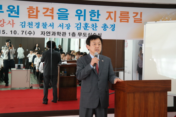 김훈찬 김천경찰서장은 김천대학교에서 경찰행정학과 학생 100여명을 대상으로 ‘경찰 공무원 합격을 위한 지름길’을 주제로 10월7일 특강을 실시했다.
