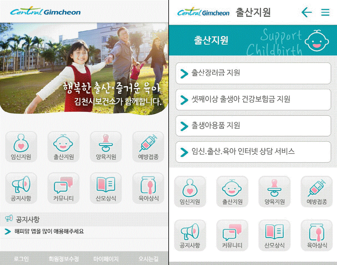 관내 임산부와 영유아 부모들은 “김천시보건소 해피맘”을 통해서 임신·출산·육아에 관한 각종 다양한 지원관련 정보를 클릭 한번으로 볼 수 있을 뿐만 아니라 궁금한 사항에 대해서 업무추진 담당자와 바로 연결되는 서비스도 제공한다. 그리고 김천시보건소 홈페이지와 링크시켜 보건관련 정보도 한번에 볼수 있도록 다양한 기능들을 추가하였다.