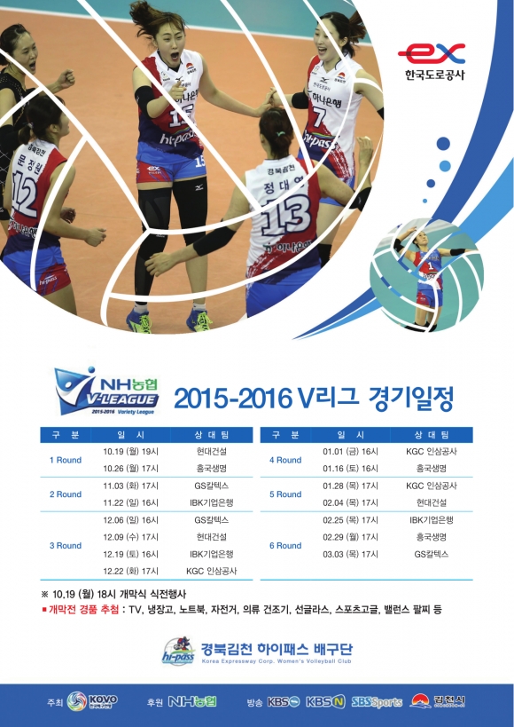 개막전은 무료입장이며 개막전 경기 후 추첨을 통해 TV, 냉장고, 노트북, 자전거, 의류 건조기, 선글라스, 스포츠고글, 밸런스 팔찌 등 다양한 경품도 지급된다. 프로배구는 동계 스포츠로 사랑받고 있으며, 6개팀이 참가하여 6라운드(5경기×6라운드=30경기)로 진행된다. 홈에서 15경기, 15경기는 원정으로 소화하게 된다.