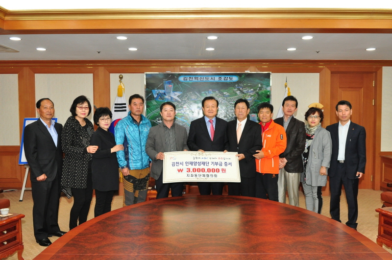 김천의 교육발전을 위해 지좌동 체육회(회장 손진원, 김금옥)에서 김천시인재양성재단(이사장 박보생)에 장학기금 3백만원을 기탁했다.