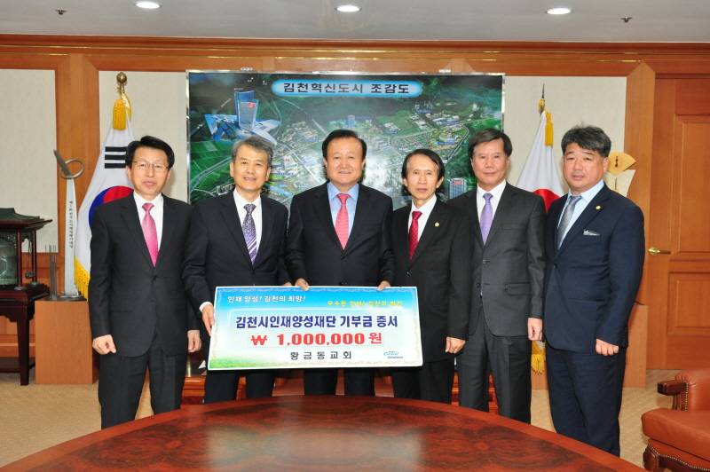 지난 10월 20일 2층 접견실에서 이현세 황금동교회 담임목사는 “우수인재 육성을 통하여 김천의 미래를 준비하는 시장님의 열정에 조금이나마 보탬이 되고자 김천시인재양성재단에 1백만원을 기탁하게 됐다.”고 말했다.
