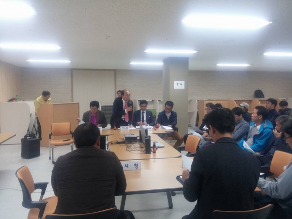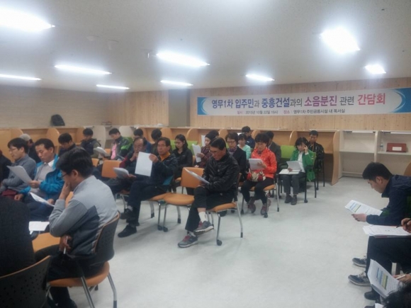이날 회의는 김천시의회 박희주 산업건설위원장, 김천시 환경관리과장을 비롯한 시 공무원 7명, 이해당사자인 영무예다음1차아파트 입주자 30명, 중흥종합건설 김태호 현장소장 및 직원 4명 등 총 40여명이 참석하여 열띤 토론을 펼쳤다.