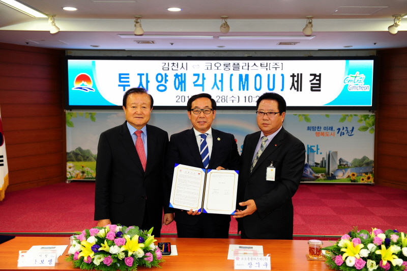 |  | | | ⓒ 김천내일신문 | | 김천시(시장 박보생)는 10월 28일 시청2층 회의실에서 박보생 김천시장, 장희구 코오롱플라스틱 대표이사 등 관계자들이 참석한 가운데 ‘김천일반산업단지(2단계) 부지내 공장설립과 관련한 투자양해각서(MOU)'를 체결했다. 이번에 체결한 투자양해각서에 따라 코오롱플라스틱(주)은 김천일반산업단지(2단계) 내 6만 6000㎡(약 2만평)의 공장부지를 매입하고 향후 생산설비 증설 등 적극적인 투자를 시행하고, 김천시도 사업추진에 맞춰 최대한의 행정적 지원을 할 방침이다.