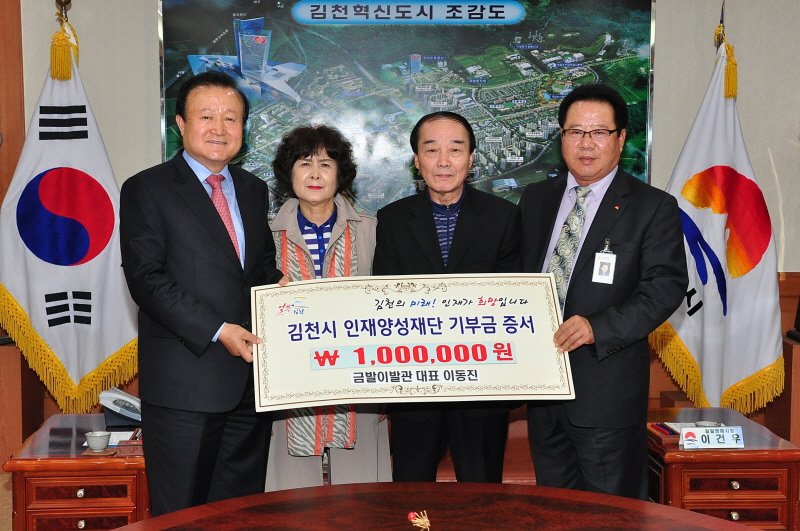 |  | | | ⓒ 김천내일신문 | | 김천의 교육발전과 글로벌 인재육성을 위해 이동진 금발이발관 사장이 김천시인재양성재단(이사장 박보생)에 장학기금 1백만원을 기탁했다.
