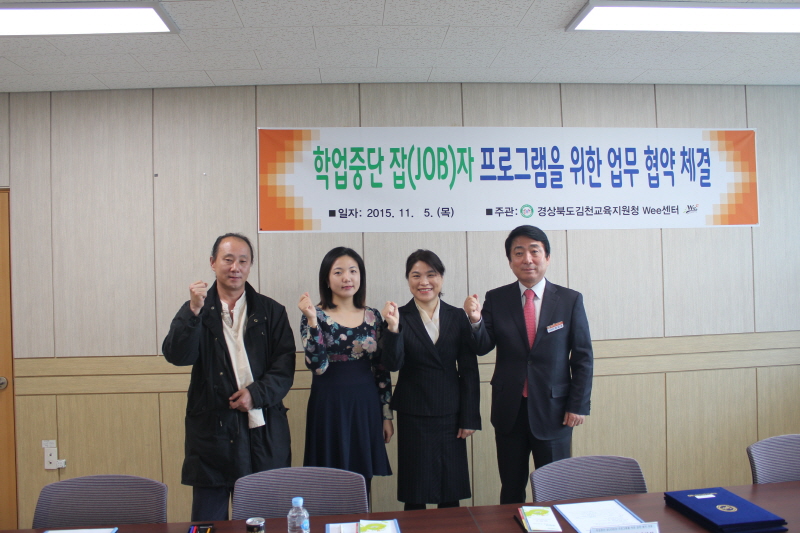 |  | | | ⓒ 김천내일신문 | | 경상북도김천교육지원청 Wee센터(센터장 권오균)는 2015년 11월 5일 GOOD발달지원센터, 이진선쿠킹스튜디오, 도문요와 학업중단 잡(JOB)자 프로그램을 위한 업무협약을 체결하였고 밝혔다.