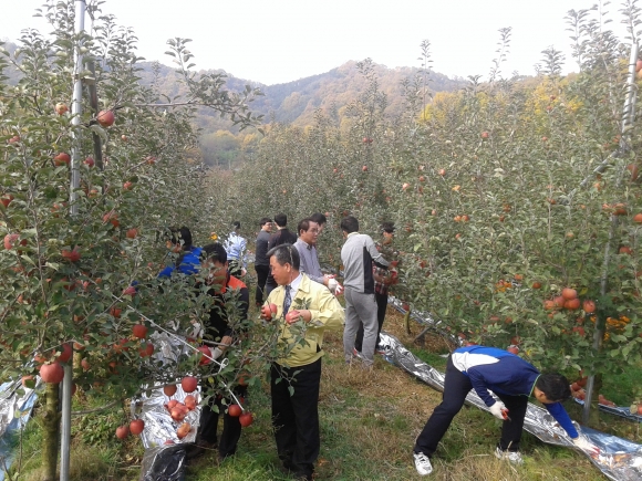 남면 봉천리 농가주로부터 사과를 따는 요령을 설명을 들은 뒤 곧바로 사과따기에 나섰다. 제법 넓은 사과밭이었지만 조달품질원 직원들의 적극적인 일손돕기로 사과수확은 예정보다 빨리 진행되었다.