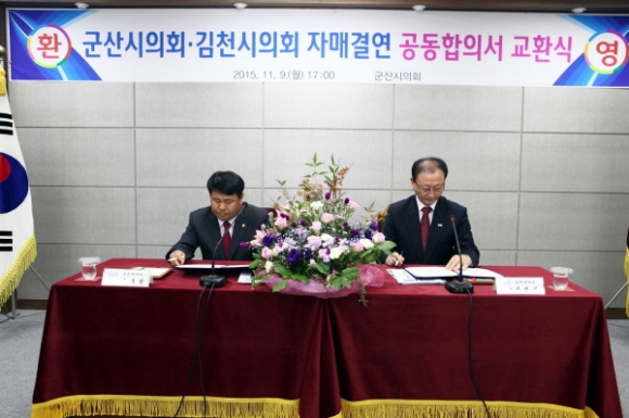 공동합의서 교환식에는 김병철 김천시의회의장과 진희완 군산시의회의장을 비롯한 양측 지방의회 의원 등 40여명이 참석하여, 상생 발전을 위해 서로 협력하고 다양한 교류활동을 적극 추진하는데 합의했다.