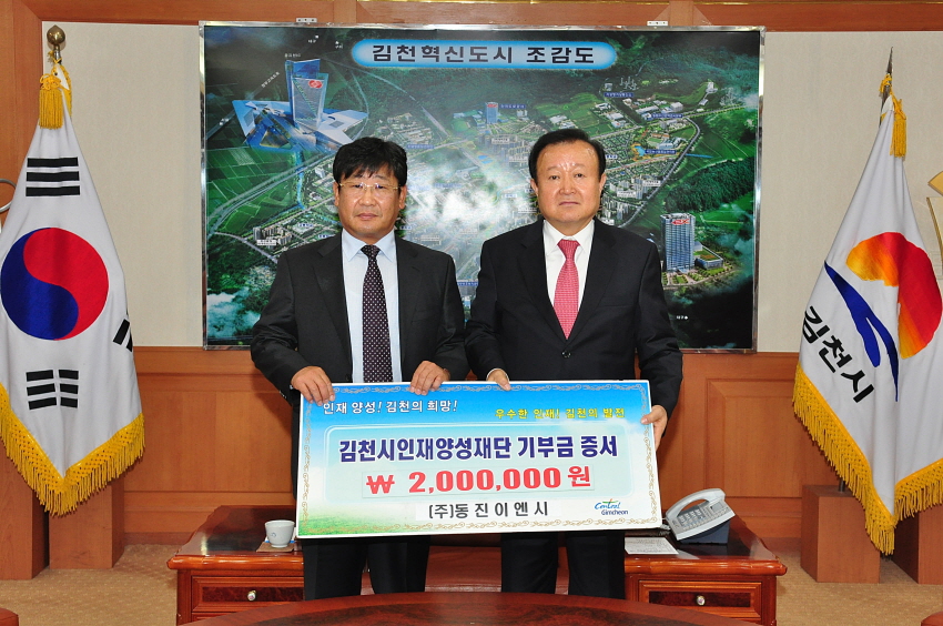 지난 11월 10일 김창수 (주)동진이엔시 대표는 “성공적인 혁신도시 건설과 명품교육도시를 조성하고 우수한 인재육성에 최선의 노력을 하고 있는 김천시에 작으나마 도움이 되고자 장학금 2백만원 기탁하게 됐다.”고 말했다. 박보생 재단이사장은 이 자리에서 “기업 경기도 어려운데 장학금을 기탁해 주어 감사드리고, 기탁해주신 장학금을 잘 관리하여 학생들에게 실질적인 혜택이 돌아갈 수 있도록 하겠다.”고 말했다.