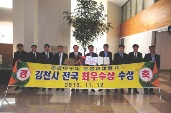 김천시(시장 박보생)는 환경부에서 실시한 ‘2015년도 공공하수도 운영관리 실태평가’에서 전국 최우수기관으로 선정돼 11월12일 환경부로부터 최우수 기관 인증패와 동시에 시상금 3천만원을 수상했다.