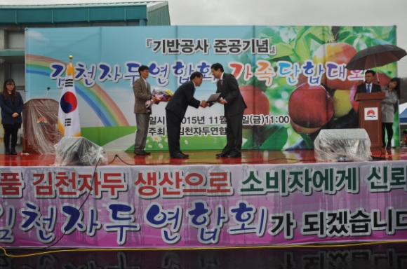 김천시 자두연합회(회장 양정규)는 지난11월13일 구성면 양각리 사무실 전정에서 연합회원및 지역주민 500여명이 참석한한 가운데 기반공사 준공기념과 연합회 단합대회가 개최됐다.