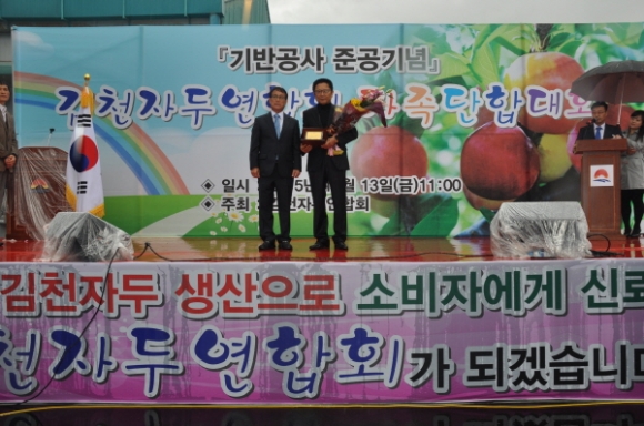 “명품 김천자두생산으로 소비자에게 신뢰받는 김천자두연합회가 되겠습니다”.라는 캐치플레이어를 내걸고 양정규 자두연합회장은 1600여 회원을 대표하여 자두연합회 발전에 많은 도움을 준 김천시장, 김천시 의회의장, 직전 신도근회장에게 감사패를 수여하였다.