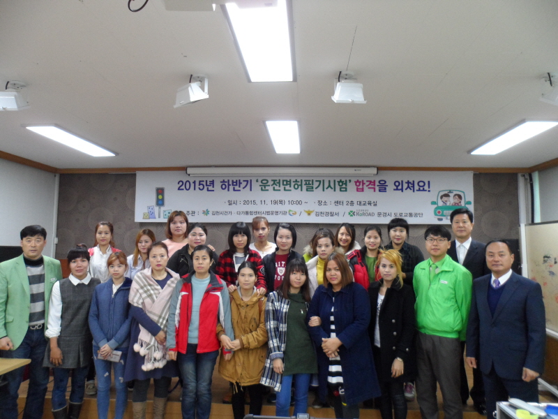 김천경찰서는 지난 10월부터 결혼이주여성으로 구성된 수강생 28명을 대상으로 김천시다문화가족지원센터에서 매주 1회 2시간씩 면허시험 강좌를 4주 동안 개설하여 학과시험 대비 강의, 교통안전교육 수강, 신체검사, 학과시험 순으로 진행해 면허취득에 큰 어려움 없이 18명(64.2%)의 응시생이 합격의 영광을 차지하였다.