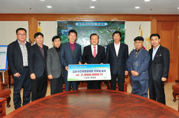 여의동 구성면 체육회장은 “2015년 시민체육대회에서 면민들이 한마음 한뜻으로 응원을 한 결과, 응원상을 받을 수 있었다. 기쁜 마음을 시민들과 함께 하고 싶어 이사회에서 장학금 기탁을 결정하였으니, 김천의 교육과 학생들의 미래에 대한 관심이라 생각하고 소중하게 사용해주기를 바란다.”고 말했다.