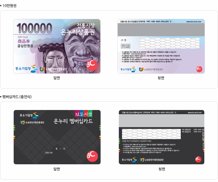 중소기업청과 소상공인진흥공단은 기존 지류상품권외에 5만원권, 10만원권, 멤버쉽(충전식) 등 카드형 전자상품권을 발행하고 있다. 전자상품권은 중소기업청에 카드취급 가맹점을 등록한 업소에서만 사용 가능하다.