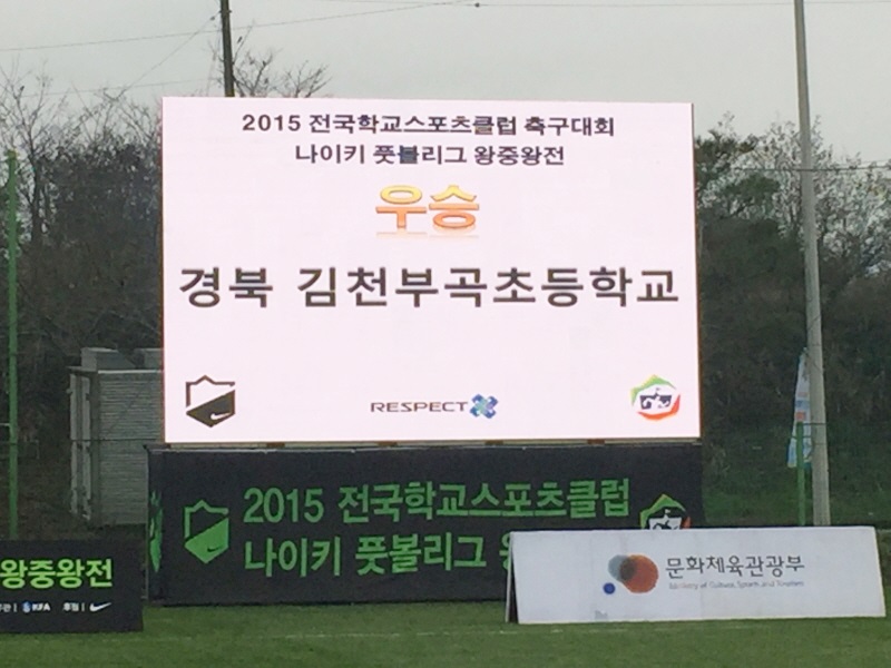 |  | | | ⓒ 김천내일신문 | | 김천부곡초등학교(교장 박삼봉) 남자축구팀은 교과부, 문화체육관광부, 대한체육회, 국민생활체육회가 공동 주최하고, 대한축구협회가 주관하는 ‘2015 전국학교스포츠클럽 축구대회 왕중왕전’에 참가하여 무실점 전승으로 우승하는 쾌거를 이루었다.