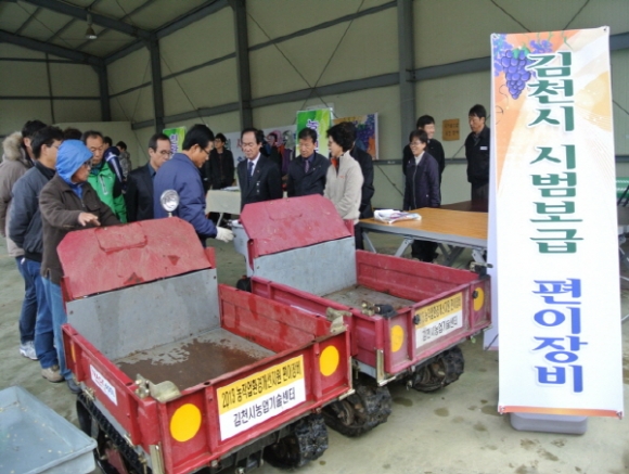 본 사업은, 새로운 농작업 편이장비에 대한 확대 보급을 비롯해 농업인 감염성 건강검진과 포도 GAP 컨설팅, 농기계 순회 수리도 함께 운영되었다. 또한, 우리 김천시에 보급된 편이장비와 농촌진흥청에서 개발한 보행 지지 운반수레 등 신기술 편이장비가 함께 전시되었다.