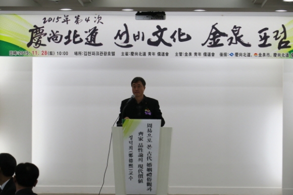 경상북도 청년유도회(회장 정재엽)는 분기별 경북23개시,군을 돌아가면서 개최되고 있는 “2015년 제4차 경북청년선비 문화포럼”이 11월28일 직지파크호텔에서 김천시 靑年儒道會(회장 배연)주관으로 열렸다.