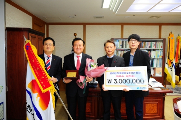 |  | | | ⓒ 김천내일신문 | | 김천시(시장 박보생)가 지난 11월 27일 경북도에서 23개 시․군을 대상으로 실시한 ‘2015년 도로정비 종합평가’에서 지난해 우수에 이어 올해는 최우수기관으로 선정되어 경상북도지사로부터 기관표창과 함께 포상금 300만원을 수상하는 쾌거를 이루었다.