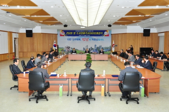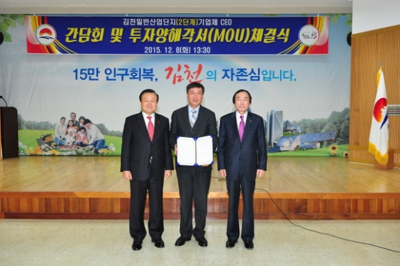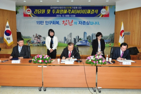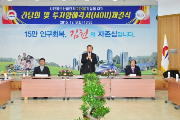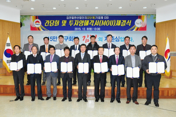 |  | | | ⓒ 김천내일신문 | | 김천시는 일반산업단지(2단계)의 53개 입주업체 중 17개 업체와 지난 12월 8일 시청 3층 강당에서 간담회 및 투자양해각서(MOU) 체결식을 가졌다.