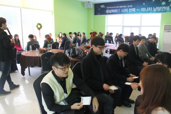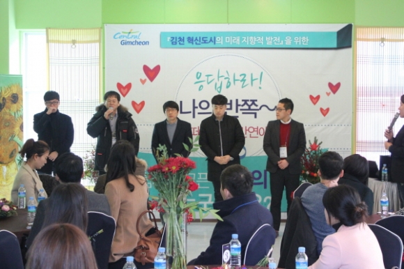 |  | | | ⓒ 김천내일신문 | | 김천시는 12월 9일 김천컨벤션웨딩 연회장에서 김천혁신도시 이전 공공기관과 관내 관공서 미혼남녀 만남 행사인 ‘응답하라! 나의 반쪽~ 떠나자 낭만연애’를 개최했다.