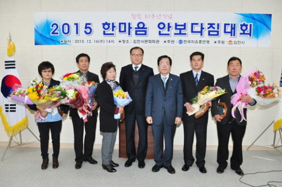 |  | | | ⓒ 김천내일신문 | | 김천시(시장 박보생)는 지난 12월 16일 김천시문화회관 소강당에서 100여명이 참석한 가운데 한국자유총연맹 김천시지회(지회장 김용대) 주관으로 ‘2015 한마음 안보다짐대회’를 개최했다.