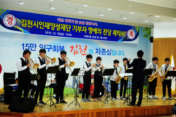 이날 제막식에는 김천시 교육경비를 지원 받아 설립 된 김천청소년팝스오케스트라의 식전 축하공연을 시작으로, 영상물 상영, 경과보고를 통해 그동안의 재단 발자취를 대내외에 알리고, 2009년 진학우수 장학생인 함지수 학생의 감사문 발표, 2015년 특기 장학생인 나진이 학생의 축하공연, 제막식 등으로 진행됐다.