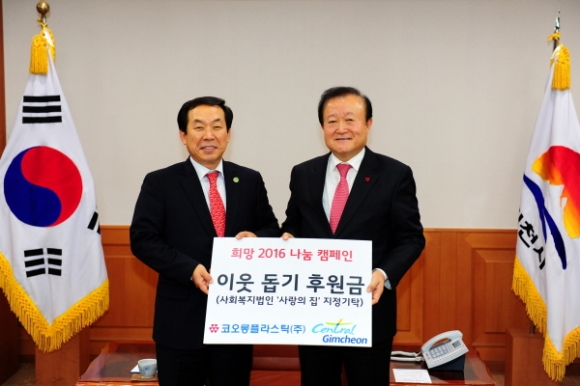 |  | | | ⓒ 김천내일신문 | | 코오롱 플라스틱(대표 장희구)은 연말 연시를 맞아 지난 12월 18일 김천시청을 방문해 관내 아동복지시설에 기탁할 후원금 1천만원을 전달하였다.