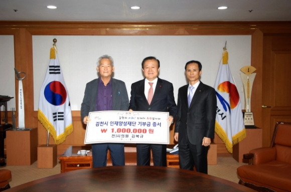 김천의 교육발전과 글로벌 인재육성을 위해 김복규 전)시의원이 김천시인재양성재단(이사장 박보생)에 장학기금 1백만원을 기탁했다.