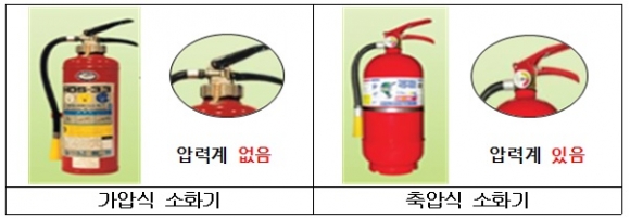 분말 소화기는 ‘가압식’과 ‘축압식’두 종류가 있는데 구분하는 방법은 손잡이 부근에 압력계가 없으면 가압식(구형)소화기이고 압력계가 있으면 축압식(신형)소화기이다. 이 압력계의 바늘이 초록색을 가리키면 소화기의 상태가 정상임을 확인할 수 있다.