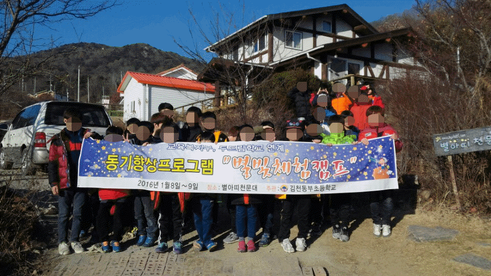 |  | | | ⓒ 김천내일신문 | | 김천동부초등학교(교장 김정범)는 지난 1월 8일에서 9일까지 1박2일간 학생, 교사 30명은 동기향상프로그램 ‘별빛체험캠프’를 운영하였다.