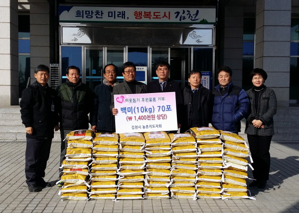 이 백미는 700명의 회원들이 지역 내 어려운 이웃들이 추운 겨울을 나는데 조금이나마 도움이 되길 바라는 마음으로 기탁했으며, 관내 읍면동 저소득 70가구에 전달될 예정이다. 한국농촌지도자 김천시연합회는 19개 읍면동 농촌지도자회를 출범하여 운영하고 있으며, 회원 700명이 친환경 농산물 생산을 위한 새 기술 보급 및 새해 소득 작목 개발을 위해 회원 상호간 기술 교류 및 우호를 다지고 있다.