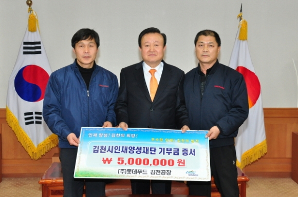 김천시 응명동에 소재한 (주)롯데푸드 김천공장(공장장 박대진, 노조위원장 김창호)에서 지난 1월 25일 5백만원의 장학금을 김천시인재양성재단에 기탁했다.