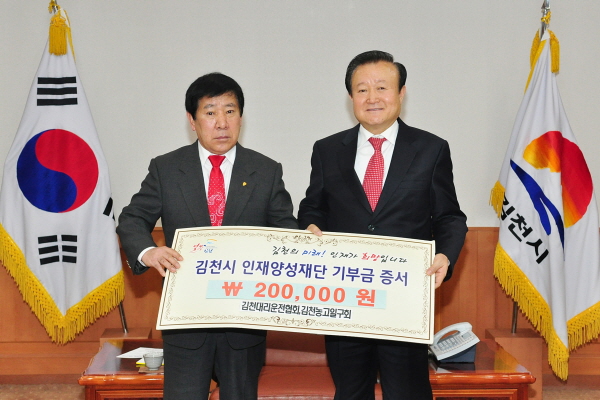 | 김천의 교육발전과 글로벌 인재육성을 위해 김천대리운전협회 및 김천농고일구회(회장 손성영)에서 김천시인재양성재단(이사장 박보생)에 장학기금 20만원을 기탁했다.