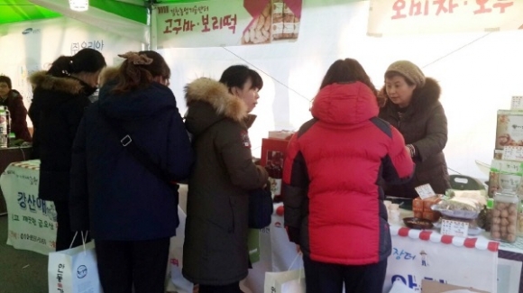 영하10℃에 가까운 추운 날씨에도 특판장을 찾는 삼성전자 임직원들의 열기는 뜨거웠다. 삼성전자 측의 사전 홍보전단지 배부를 통해 김천 농·특산물을 콕 찍어 구매하러 오는 소비자들의 발길이 이어졌다.