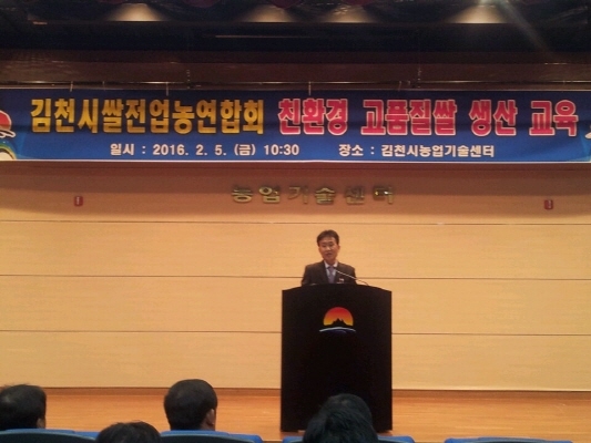 |  | | | ⓒ 김천내일신문 | | (사)한국쌀전업농연합회 김천시연합회(회장 김경권)는 지난 2월5일 김천시농업기술센터 대강당에서 박창기 농업기술센터소장 및 (사)한국쌀전업농연합회 경북도연합회 김도중 회장,남시본 부회장,문경채 감사 한국농어촌공사김천구미지사 권성군 지사장, 한국농촌지도자 김천시연합회 김홍수회장김천시친환경연합회 최재춘 회장 등 관계자들을 대상으로 2016년도 고품질 쌀 생산을 위한 회원교육을 실시했다.