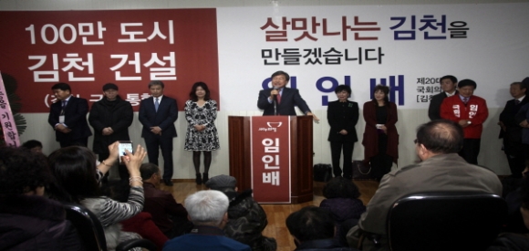 |  | | | ⓒ 김천내일신문 | | 김천, 4월13일 제20대 총선 출사표를 던진 3선 국회의원을 역임한 임인배 예비후보자는 지난2월15일 지인, 지역주민들 2300여명이 참석한 가운데 대신동 선거사무소 개소식을 가졌다.