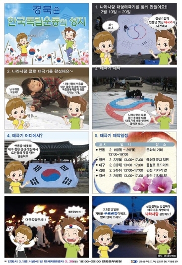먼저 안동에서는 2월 19일부터 2월 29일까지 11일간의 일정으로 신한은행 앞 문화의 거리에서 진행되며 22(월) 영천에서는 금호강 둔치 일원, 23(화) 대구는 동성로 로드아트, 24일(수)은 김천 기차역앞, 25(목)에도 경산 기차역 앞에서 개최되며 진행시간은 각13시에서 17시까지 이다 경상북도 도민들의 뜻을 모아 제작된 나라사랑 대형태극기는 2월 29일(월) 18:00 웅부공원에서 개최되는 3.1절 기념식 및 만세재현횃불행사의 거리행진에 쓰일 예정이어서 의미를 더 할 것이다. 아울러 3·1절 당일에는 기념관 무료관람이다