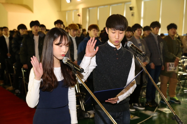 신입생 대표 성채운(간호학과)군과 김혜정(작업치료과)양은 입학선서를 통해 "학칙을 준수하고 교훈인 근면, 성실, 정직의 정신을 바탕으로 인격을 도야하며 학문연구를 본분으로 삼아 자랑스러운 학생이 되겠다."고 선서했다.