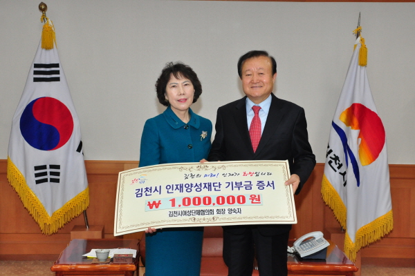 | 김천시 미래를 위한 우수인재육성과 김천교육발전을 위해 조성 중인 김천시인재양성재단(이사장 박보생)에 김천시여성단체협의회 양숙자 회장이 지난 3월 3일 김천시청을 방문하여 장학기금 1백만원을 기탁했다.