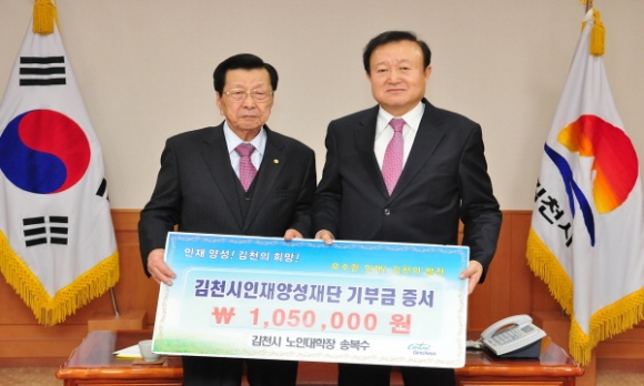 | 김천의 교육발전과 글로벌 인재육성을 위해 송복수 김천시 노인대학장이 김천시인재양성재단(이사장 박보생)에 장학기금 1백만원을 기탁했다고 전했다.