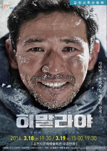 |  | | | ⓒ 김천내일신문 | 김천시문화예술회관(관장 장귀희)에서는 시민들에게 건전한 여가선용과 볼거리를 선사하기 위하여 특선영화『히말라야』를 오는 3월18일 오후 7시 30분과 3. 19(토) 오후 3시, 오후 7시 30분 3회에 걸쳐 대공연장에서 상영한다.
