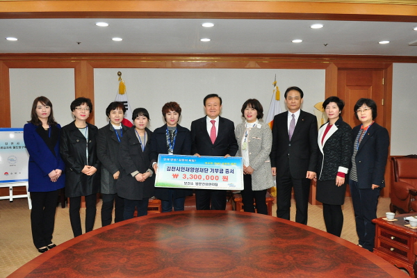 | 김천의 교육발전과 글로벌 인재육성을 위해 보건소 방문건강관리팀(전담인력 간호사 10명, 물리치료사 1명)에서 김천시인재양성재단(이사장 박보생)에 장학기금 330만원을 기탁했다.