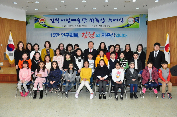 | 지난 3월 9일 오후 3시 김천시청 3층 강당에서는 김천시장 박보생, 각 예술단 지휘자, 학부모 등이 참석한 가운데 2016 김천시립예술단 신규단원에 대한 위촉장 수여식을 가졌다.