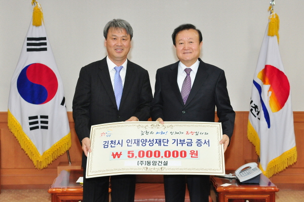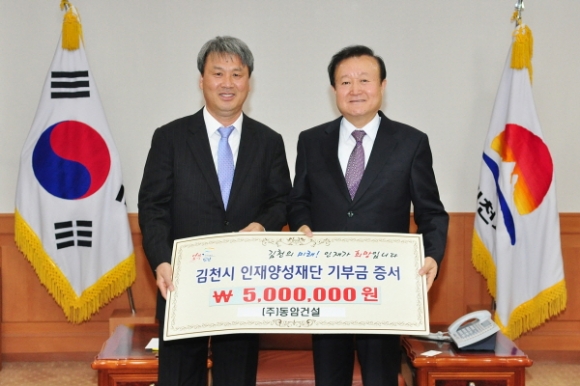 | 김천의 교육발전을 위해 (주)동암건설(대표 석동기)에서 지난 3월 14일 김천시인재양성재단(이사장 박보생)에 장학기금 5백만원을 후원했다.