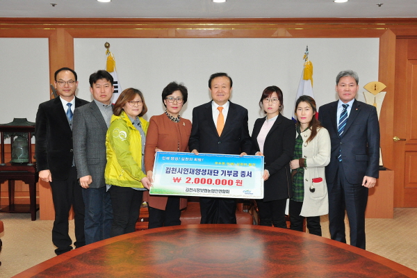 | 김천시 미래를 위한 우수인재육성과 김천교육발전을 위해 조성 중인 김천시인재양성재단(이사장 박보생)에 장학금기탁이 줄을 잇고 있다. 김천시정보화농업인연합회(회장 이명희)는 지난 3월 16일 김천시청을 방문하여 김천시인재양성재단에 장학금 2백만원을 기탁했다.