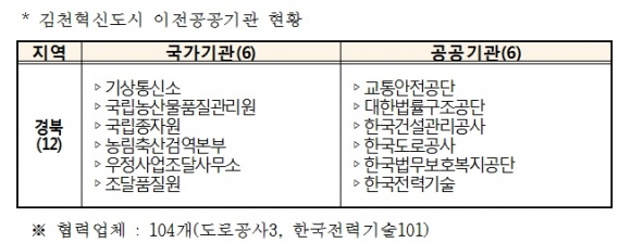 김천혁신도시는 2005년 2월 혁신도시가 확정된 이래로 사업비 8,676억원을 투입하여 12개 기관이전*이 금년 3월중에 한국법무보호복지공단과 한국건설관리공사의 이사를 끝으로 이전을 마무리하게 된다.