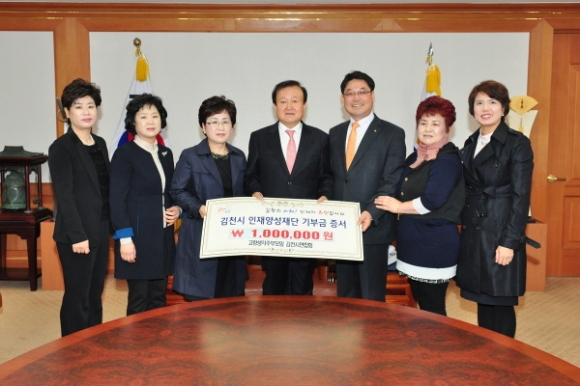 | 김천의 교육발전과 글로벌 인재육성을 위해 고향생각주부모임 김천시연합회(회장 강순옥)에서 김천시인재양성재단(이사장 박보생)에 장학기금 1백만원을 기탁했다.